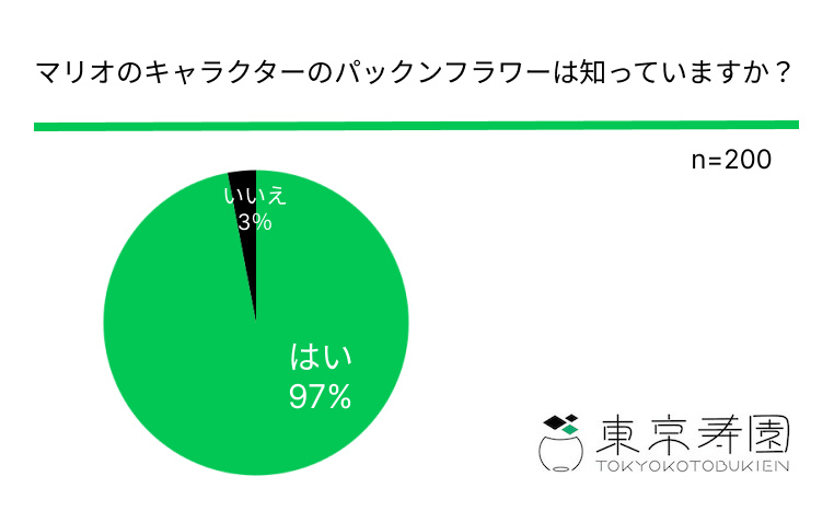 また、マリオのキャラクターのパックンフラワーの認知度も「97%」の方が認知していることがわかりました。日本を代表するゲームであり、キャラクターであることがわかりました。