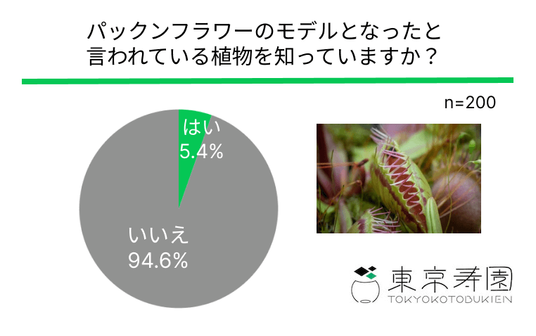 今回の調査では、最近大人気のマリオのキャラクターの「パックンフラワー」に関するアンケートを実施しました。パックンフラワーのモデルと言われている植物を知っているのかという質問に「いいえ」と回答した方が大多数でした。