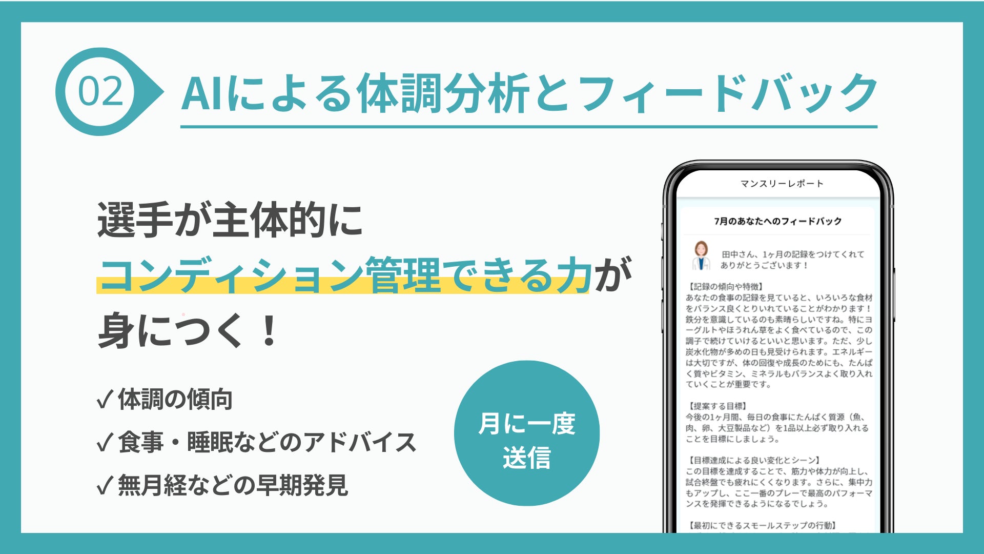 選手がコンディションを整えるための機能として、月に1回入力した体調の記録をもとに、食事・運動・生活習慣に関するアドバイスを送信します。