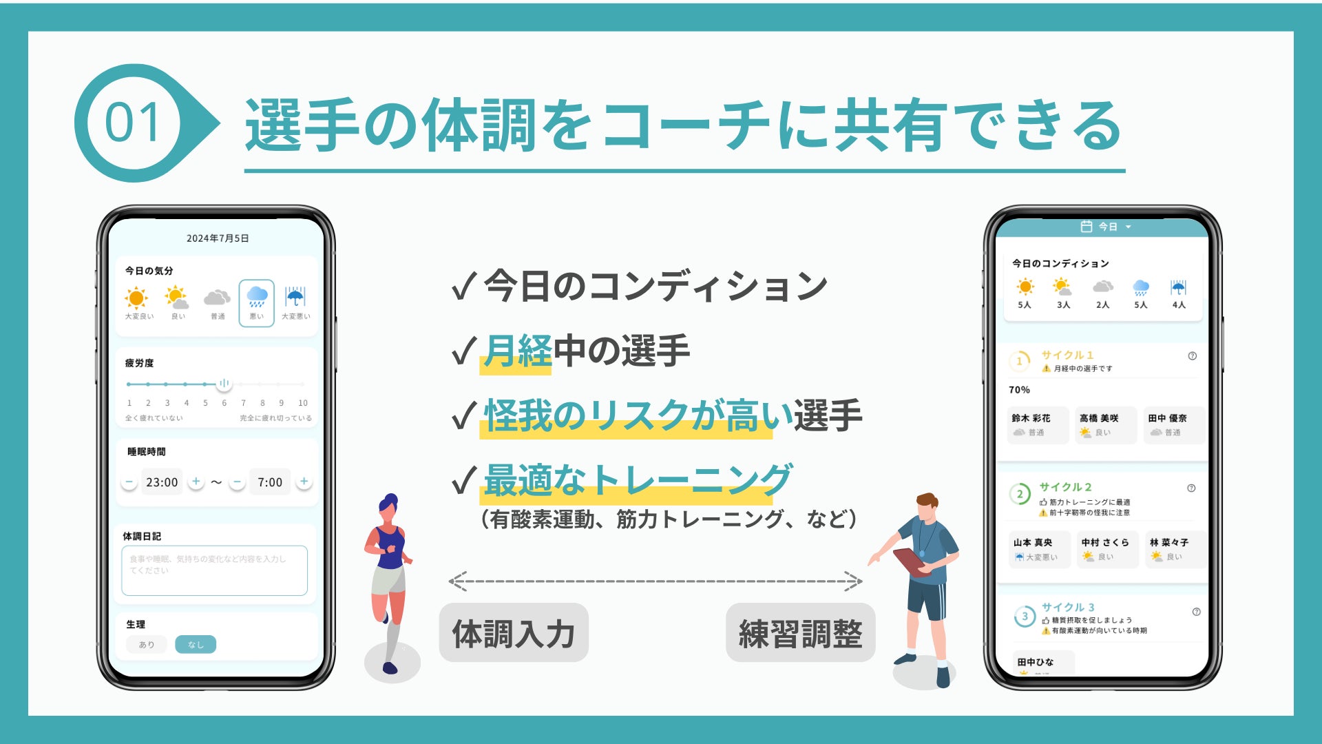 選手の月経を含む体調情報をコーチに共有でき、怪我のリスクを早期に把握することができます。