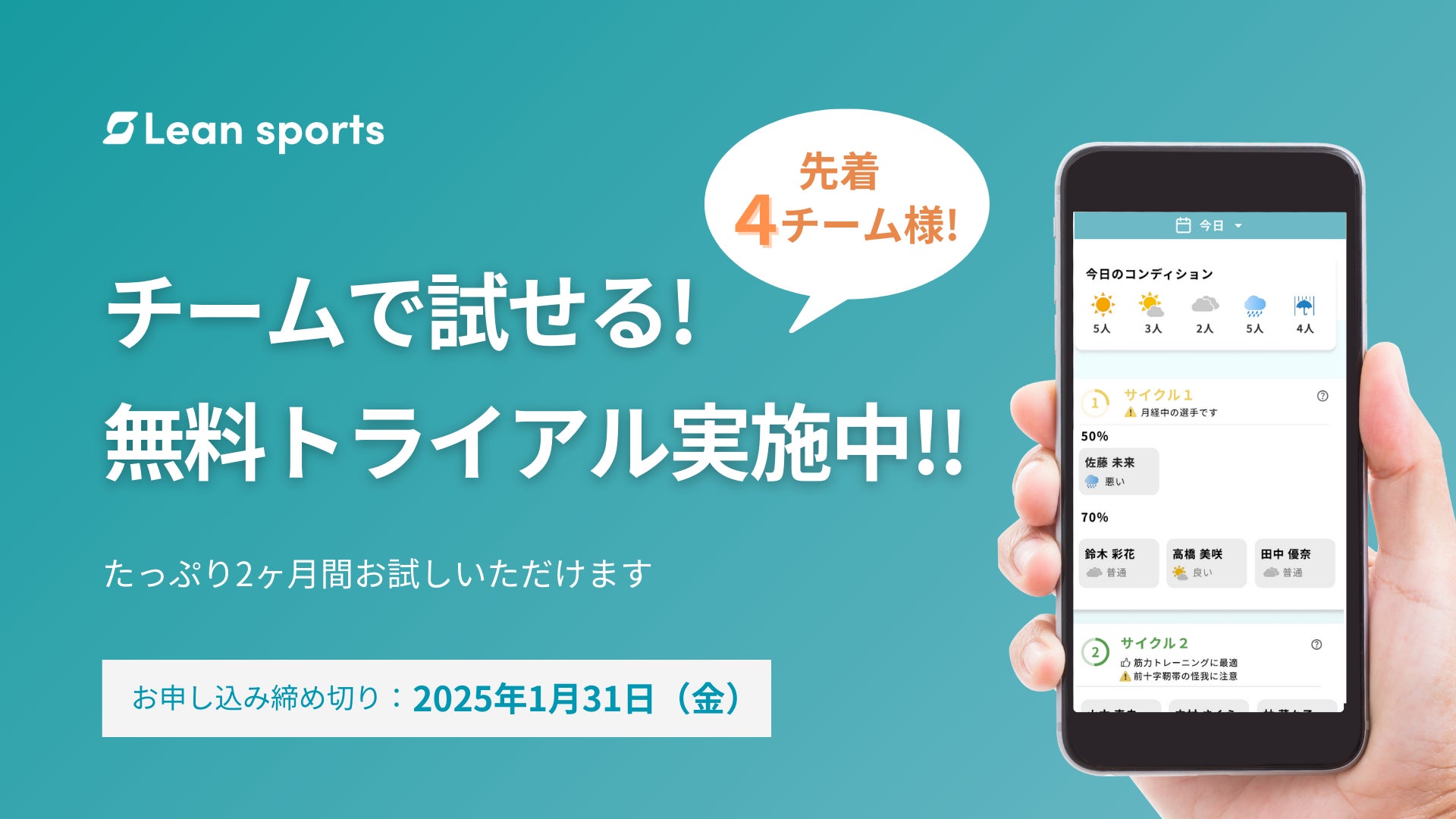 「生理で悩む人をひとりにさせない社会を創る」をミッションにかかげる株式会社LEAN(代表:立道友緯)は、2024年12月より、女子スポーツチーム専用コンディション管理アプリ「Lean sports(リーンスポーツ)」β版をリリースいたしました。