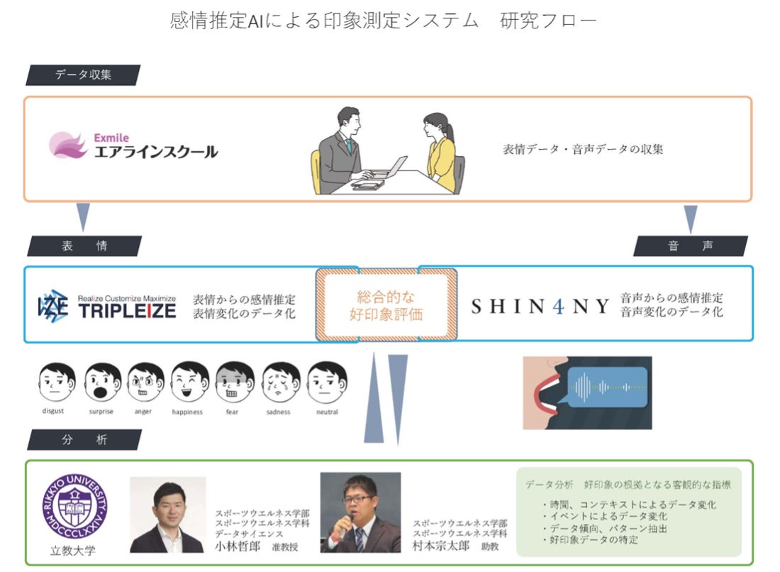 感情推定AIによる印象測定システムは、トリプルアイズの画像認識による感情推定AIエンジンとSHIN4NYの音声による感情推定AIエンジンを組み合わせることで、ユーザーが他者に与えている印象を客観的に判断するシステムです。立教大学スポーツウエルネス学部の小林哲郎准教授、村本宗太郎助教がデータ分析を行い、客室乗務員志望者の就活指導を行うエクスマイルが面接指導においてデモ導入します。表情、音声のデータ分析から印象の根拠となる総合的な指標の解析を目指します。