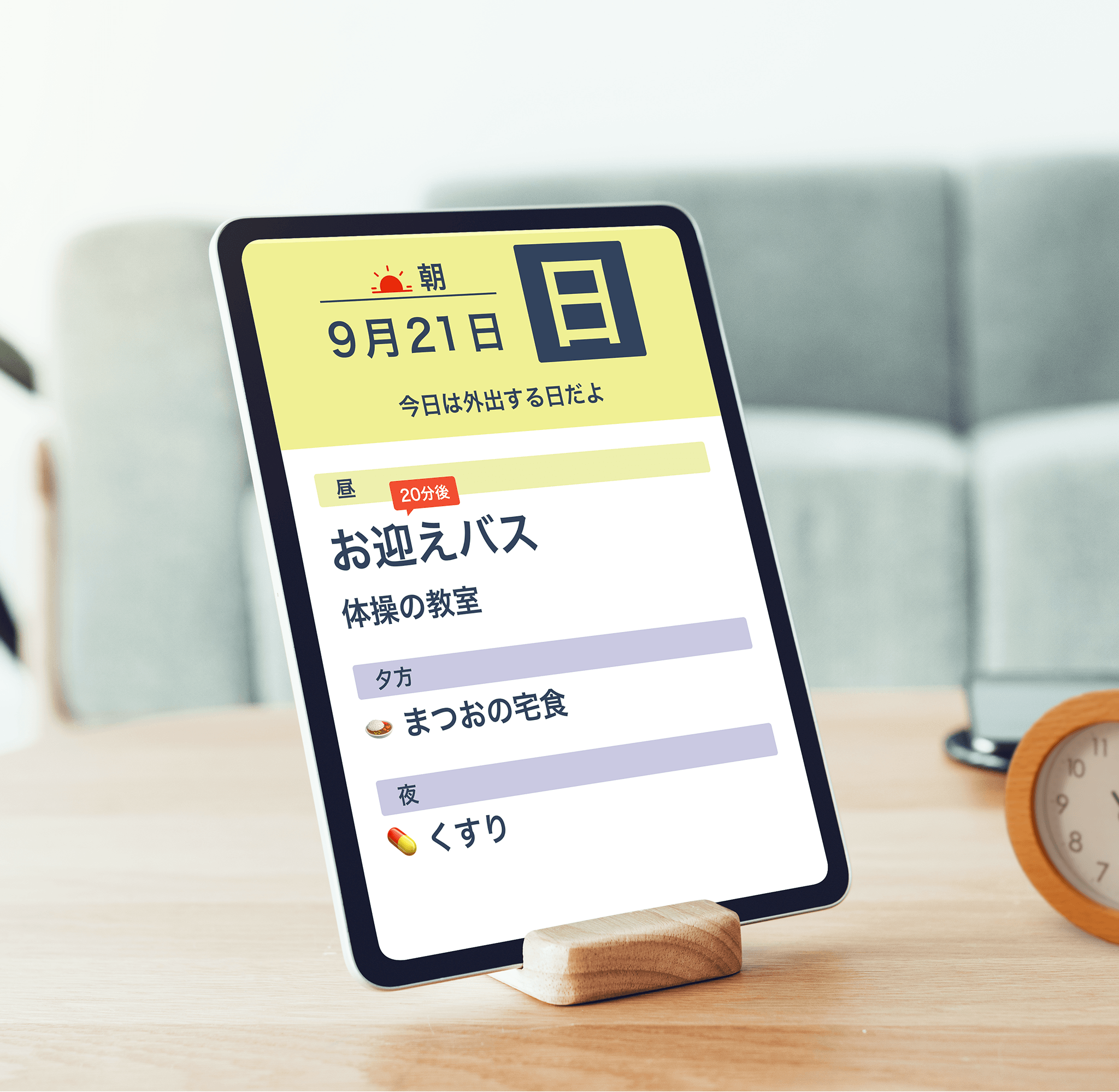 「いま」を伝える安心: 「今日は何日?」「何をする日だっけ?」という度重なる不安に対し、yotteyがそっと「いま」を提示します。