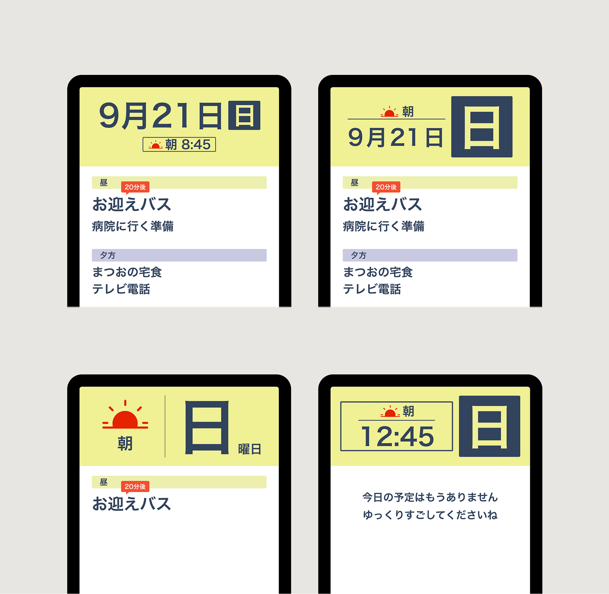 引き算の設計: 認知症の方でも迷わず、直感的に情報を認識できるよう、あえて情報量を極限まで抑えた独自のインターフェースを採用しています。