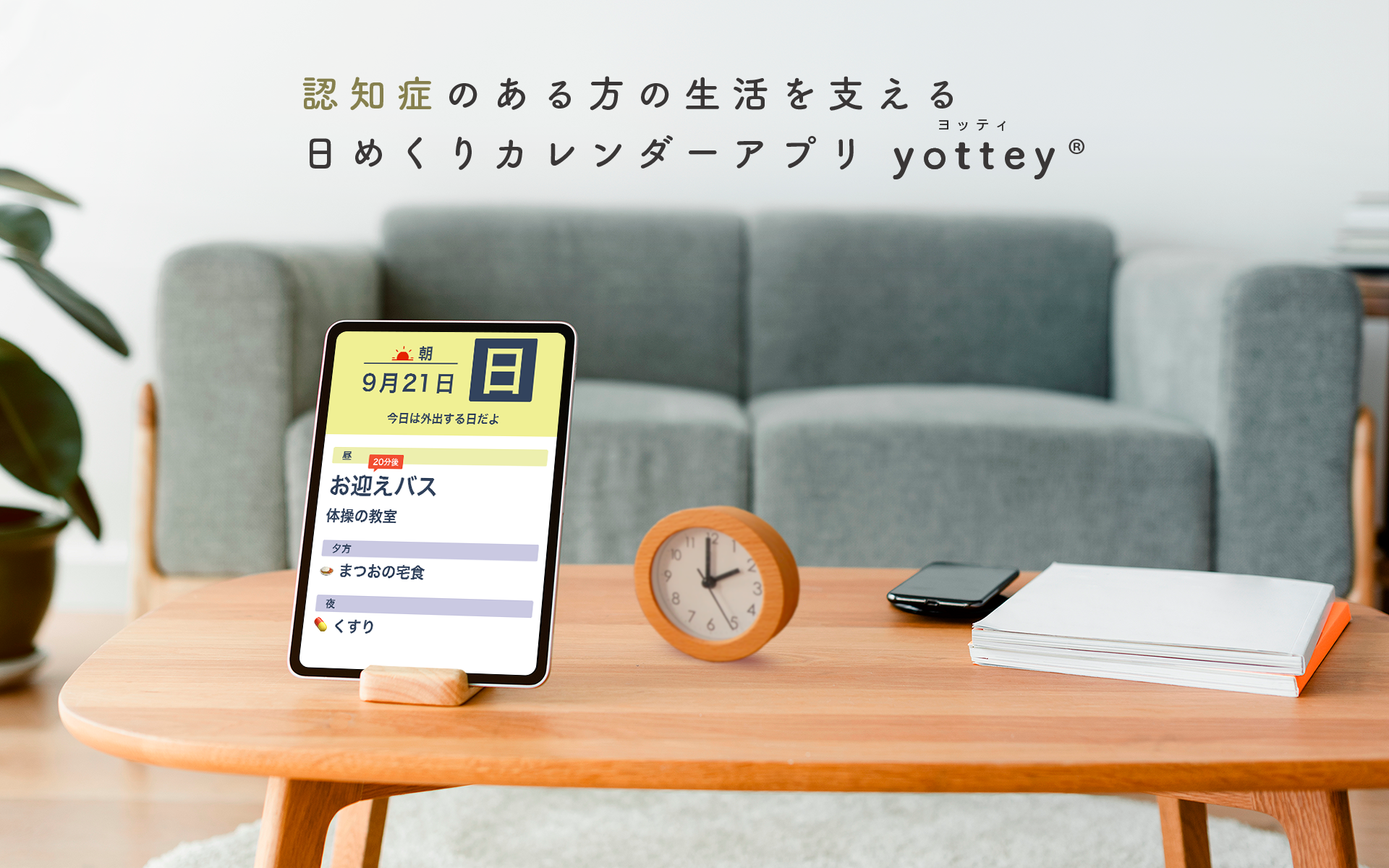 yotteyは、認知症の初期症状である見当識障害による「今日がいつか、何をする日か」という不安に寄り添う、ご家族の声かけの代わりになる日めくりカレンダーアプリです。