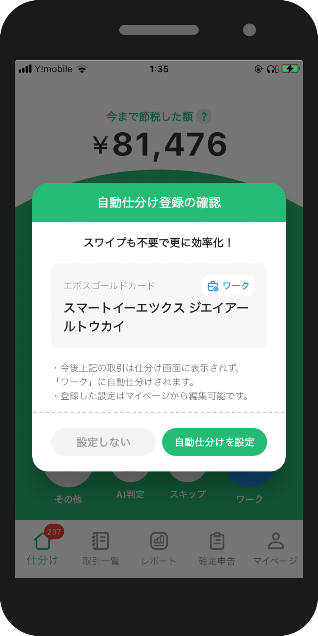 (例:スマートEXをワークに仕分け(右スワイプ)することが2回目の場合に、下記画像のように提案をします)
