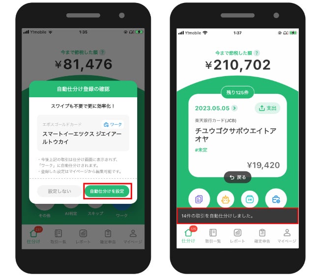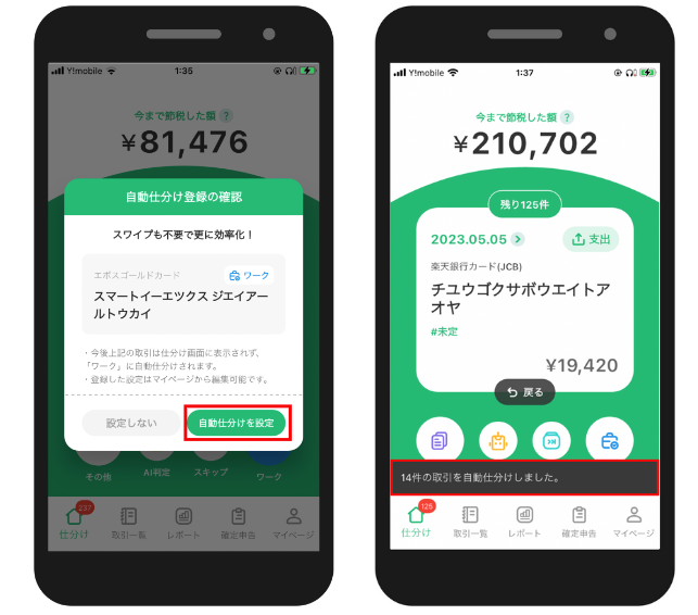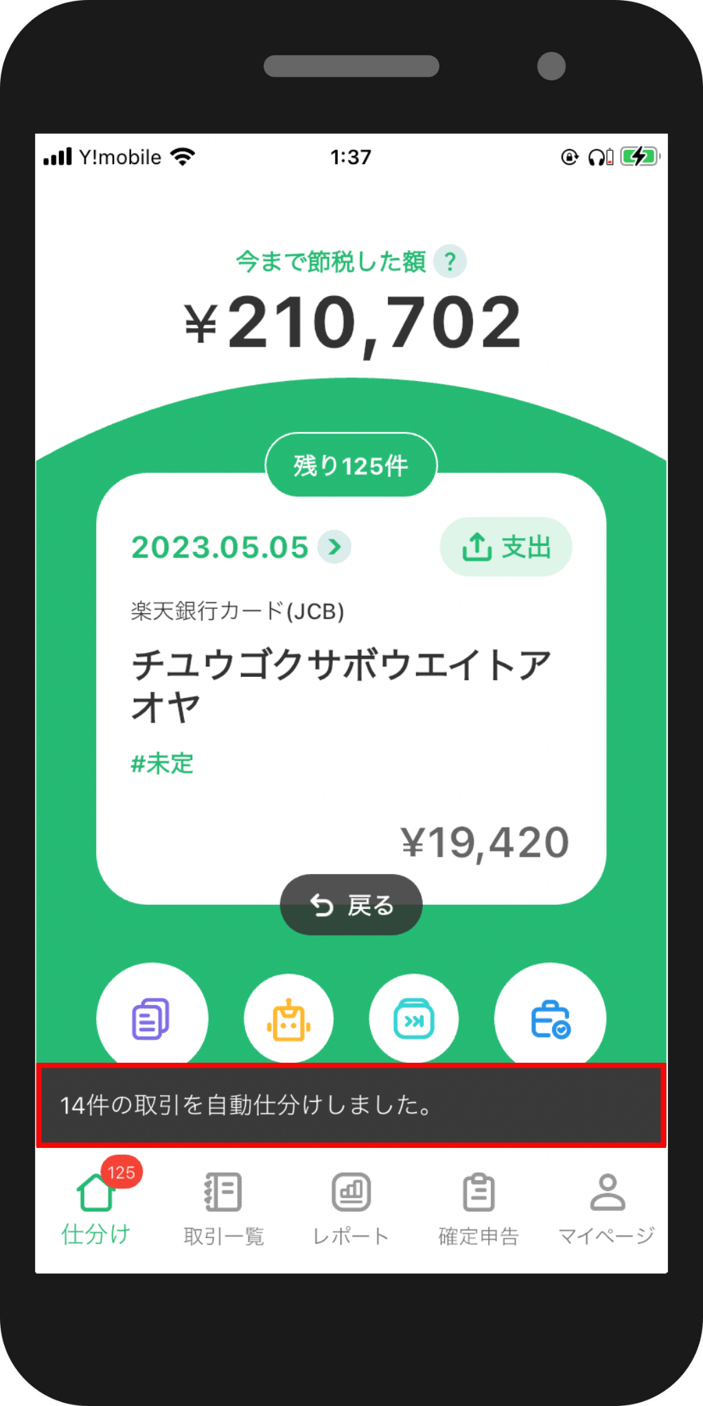設定を行うと、下記画像のように「〇件の取引を自動仕分けしました」と表示され、全て自動仕分けされスワイプすら必要なくなり、さらに効率化することができます。
