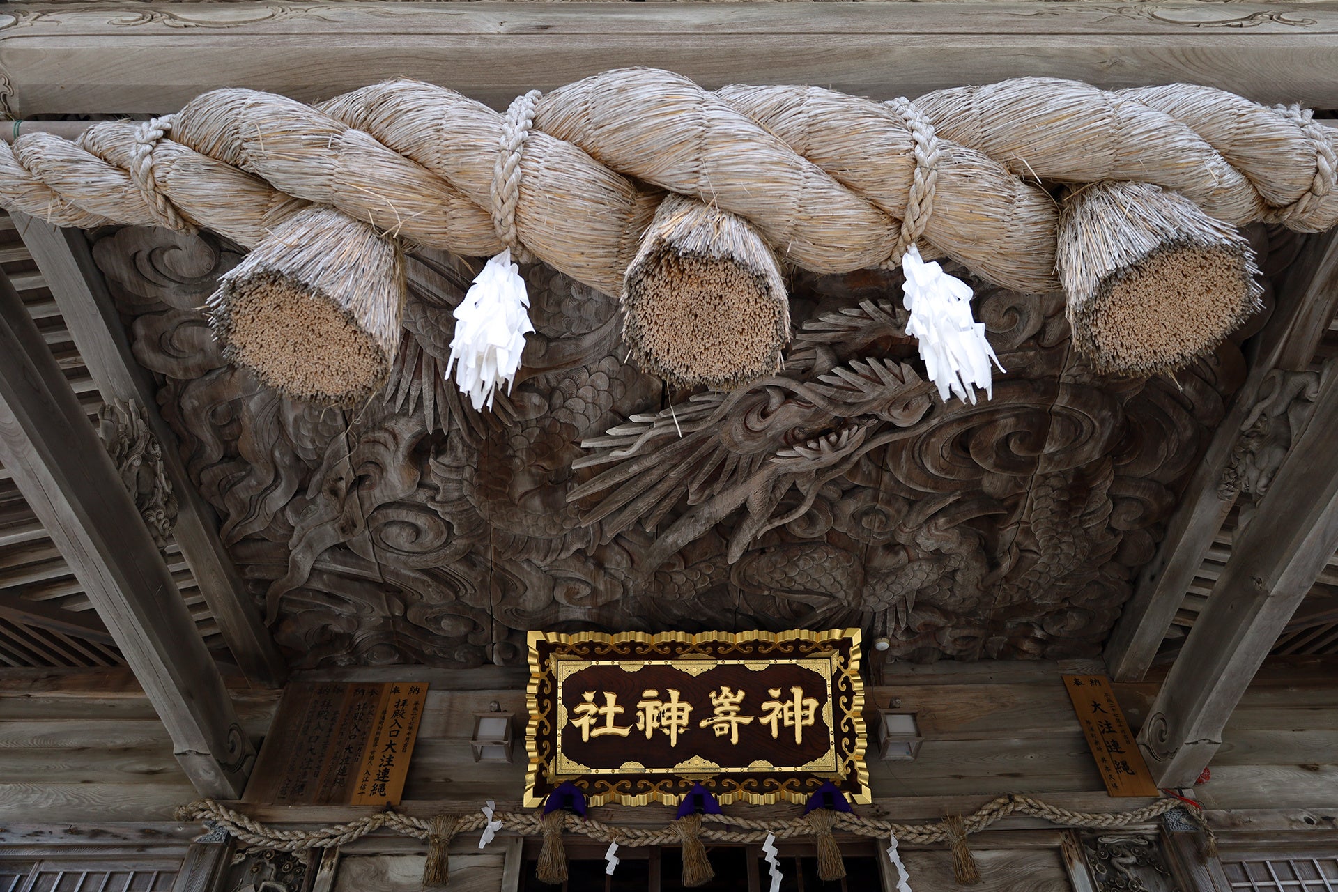 江戸時代から伝わる向拝天井の龍の彫刻は圧倒的な迫力 神﨑神社