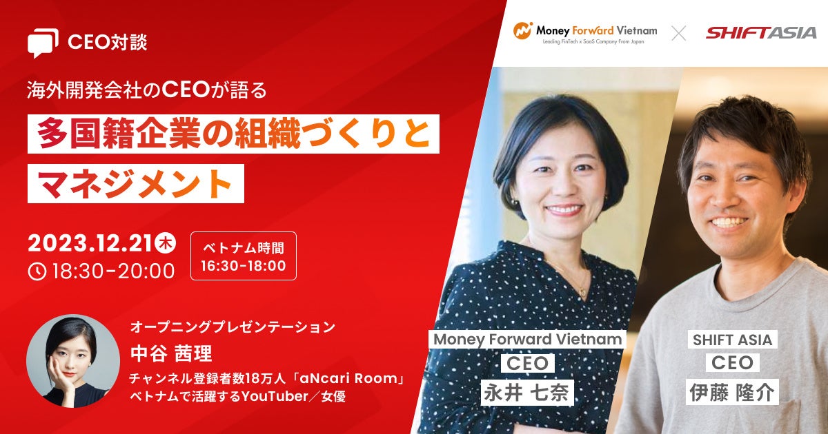 本イベントでは、マネーフォワードのグローバル開発拠点であるMoney Forward VietnamのCEOを務める永井七奈さんをお招きし、ベトナムでオフショア開発を展開するSHIFT ASIA CEOの伊藤との対談をお届けします。