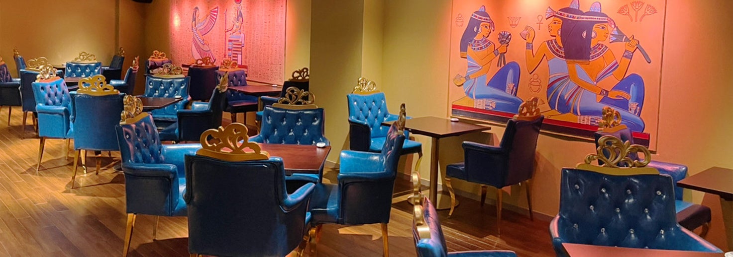 会場は1階のレストラン。エジプトをイメージしたエキゾチックな店内でソフトドリンクと軽食をつまみながらリラックスしてお話しできる雰囲気です。