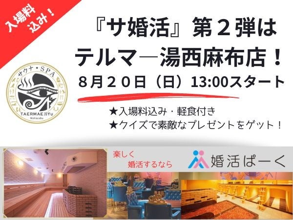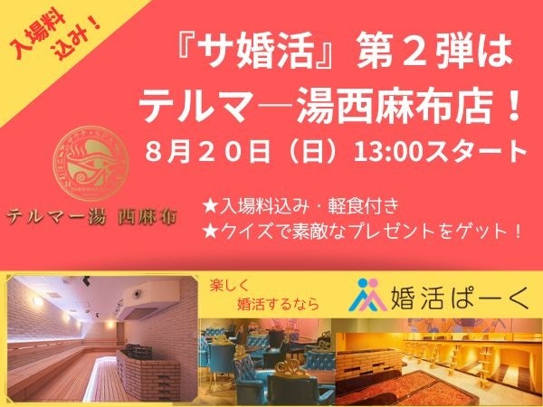大好評につき『サ婚活』イベント第2弾!更にお得にバージョンアップ♡東京メトロ日比谷線六本木駅から徒歩5分【テルマ―湯西麻布店】で開催決定♪暑い夏こそ心も体も熱く燃やそう!夏だ!サウナだ!婚活だ!