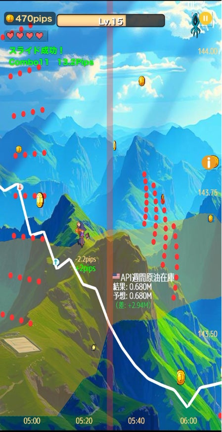 ミスなく相場を走り抜けることで「ピップ(報酬ポイント)」を獲得し、さらなる難関ステージを解放できます。