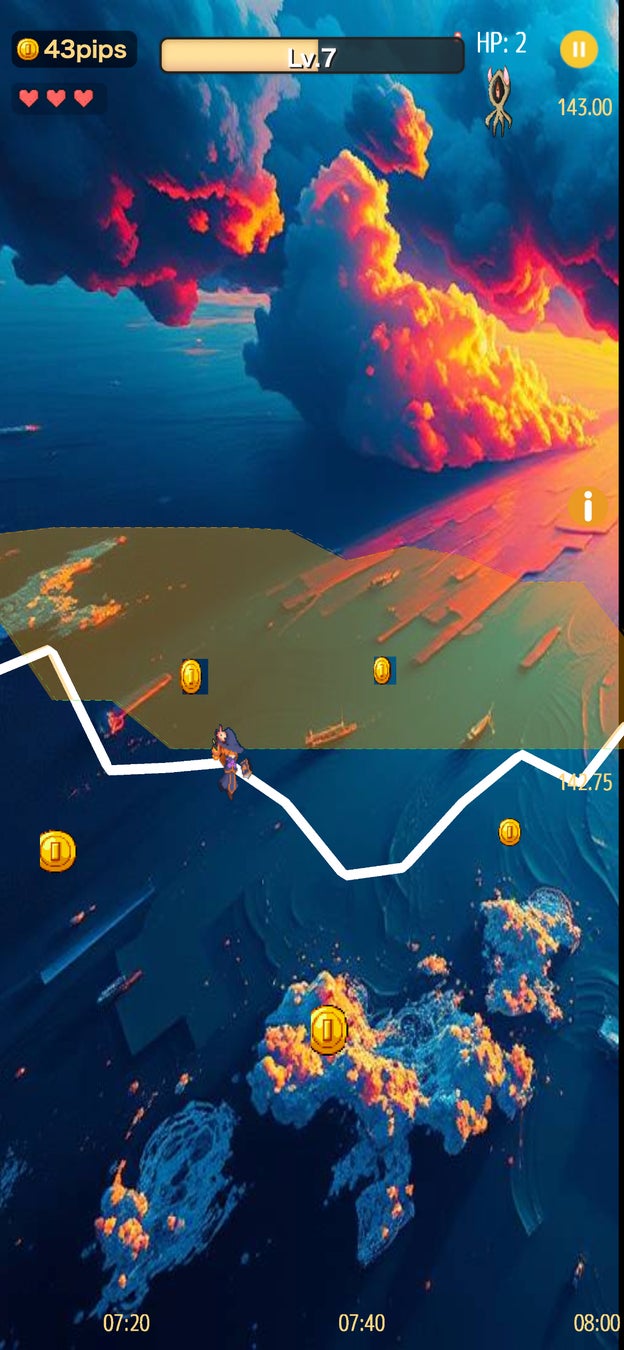 ・プレイヤーは「魔法使い」として、ダウ(先物)、日経225(先物)、ドル円、ユーロドルなどのチャートを舞台に、敵を倒しながら相場の波を乗りこなします。