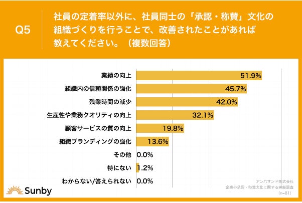 Q4で「非常にそう思う」「ややそう思う」と回答した方に「Q5.社員の定着率以外に、社員同士の「承認・称賛」文化の組織づくりを行うことで、改善されたことがあれば教えてください。(複数回答)」(n=81)と質問したところ「業績の向上」が51.9%、「組織内の信頼関係の強化」が45.7%、「残業時間の減少」が42.0%という回答となりました。