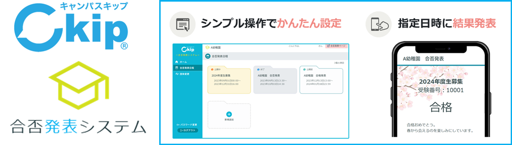 『Ckip 合否発表システム』は、分かりやすくシンプルなデザインなため操作も直観的に行うことができます。「合否発表日程の設定」「結果情報をCSVでアップロード」の2つの操作だけで利用可能となり、合否結果をあらかじめ指定した日時に即時開示できます。これにより保護者により早く結果を通知することが可能です。