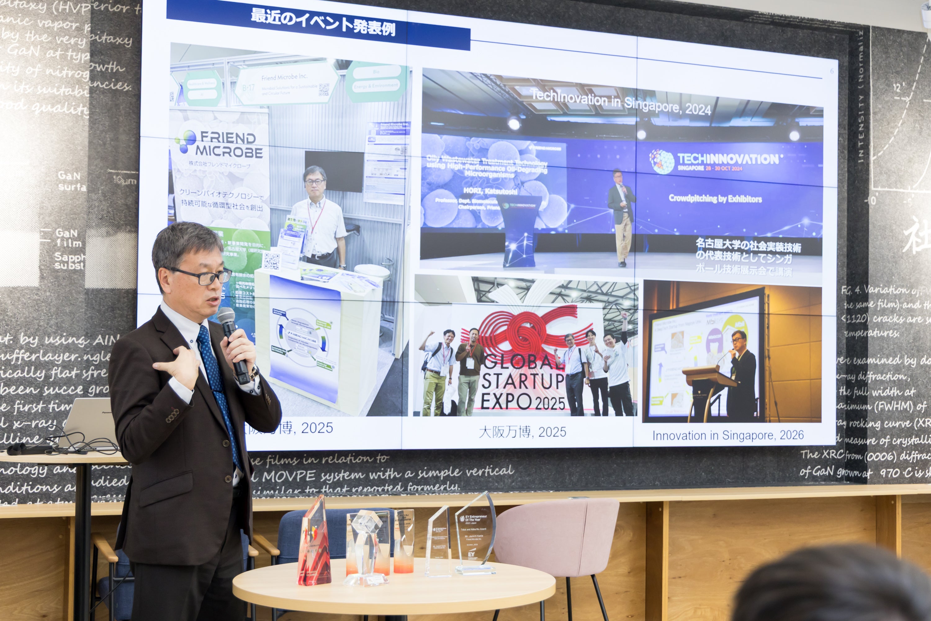 2026年3⽉6⽇、名古屋⼤学 Tokai Open Innovation Complex 名古屋サイト(TOIC名古屋)1階共有スペースにて、「バイオエコ産学協同研究講座」の開設記念レセプションを開催しました。当⽇は、講座創設のご報告とともに、GX、サーキュラーエコノミー、バイオ製造技術による環境負荷低減の未来像や、産学による共創の⽅向性についてご紹介しました。
