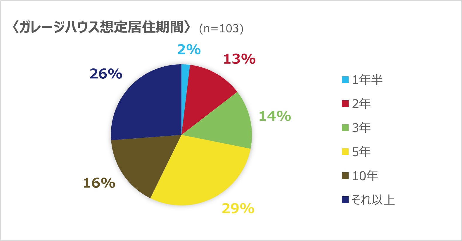 ガレージハウス検討者の居住想定期間は10年以上と回答した方が42%を占め、長期入居を希望する方が多く見受けられます。(※第26回賃貸住宅市場景況感調査『日管協短観』 (2022年11月 公益財団法人 日本賃貸住宅管理協会 日管協総合研究所)によると、平均居住期間は首都圏4年5カ月、関西圏4年)