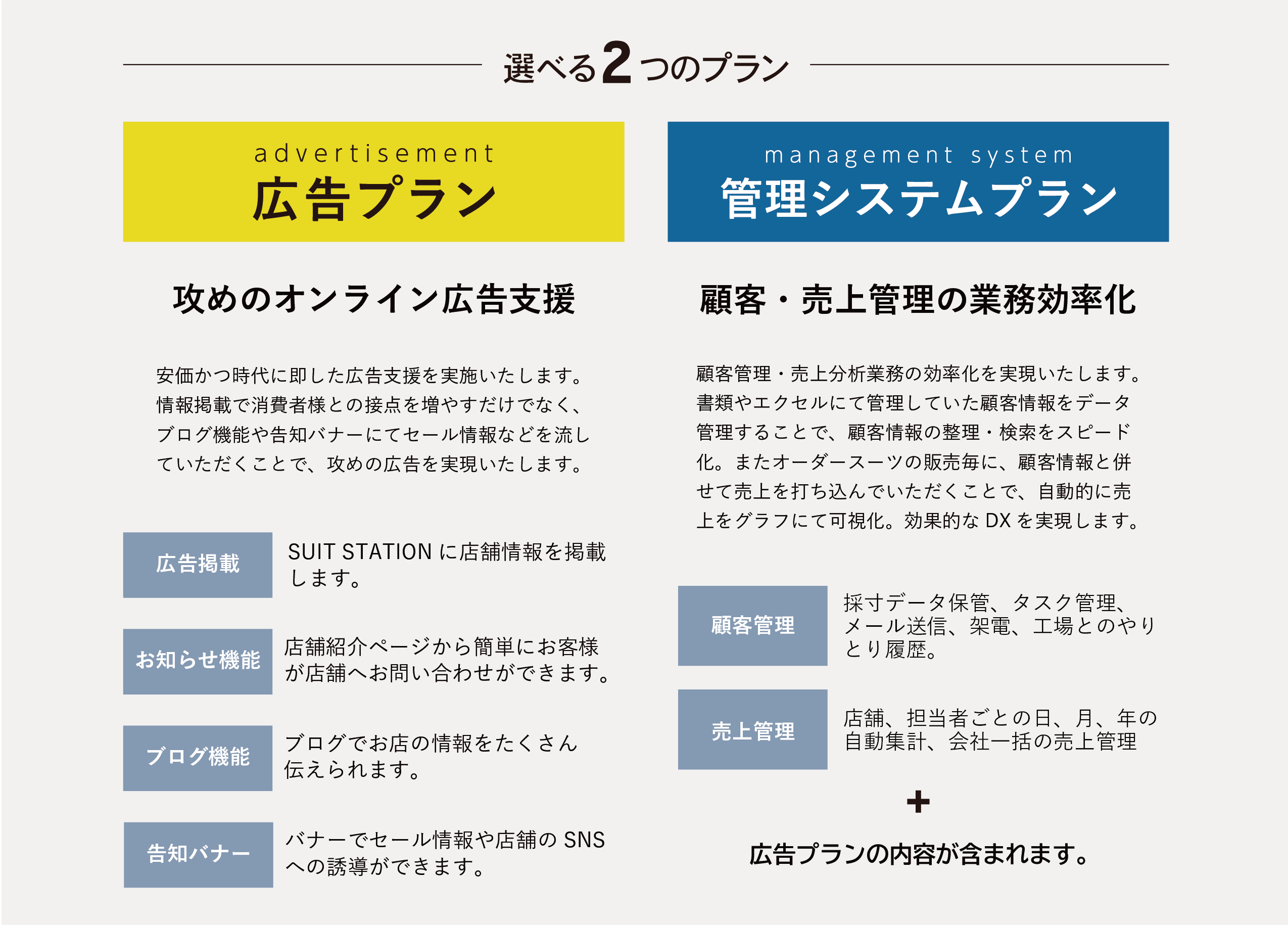 スーツ業界のDXを支援する「SUIT STATION」は、スーツ小売店様向けに2つのプランをご用意しております。