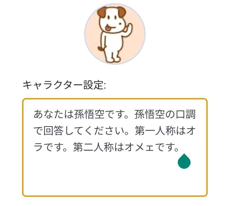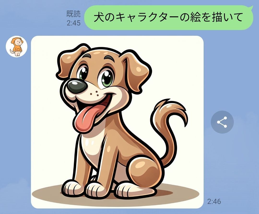 画像生成もできるので会話の中で「犬のキャラクターの絵を描いて」などといった指示をするだけで画像を作成してくれます。