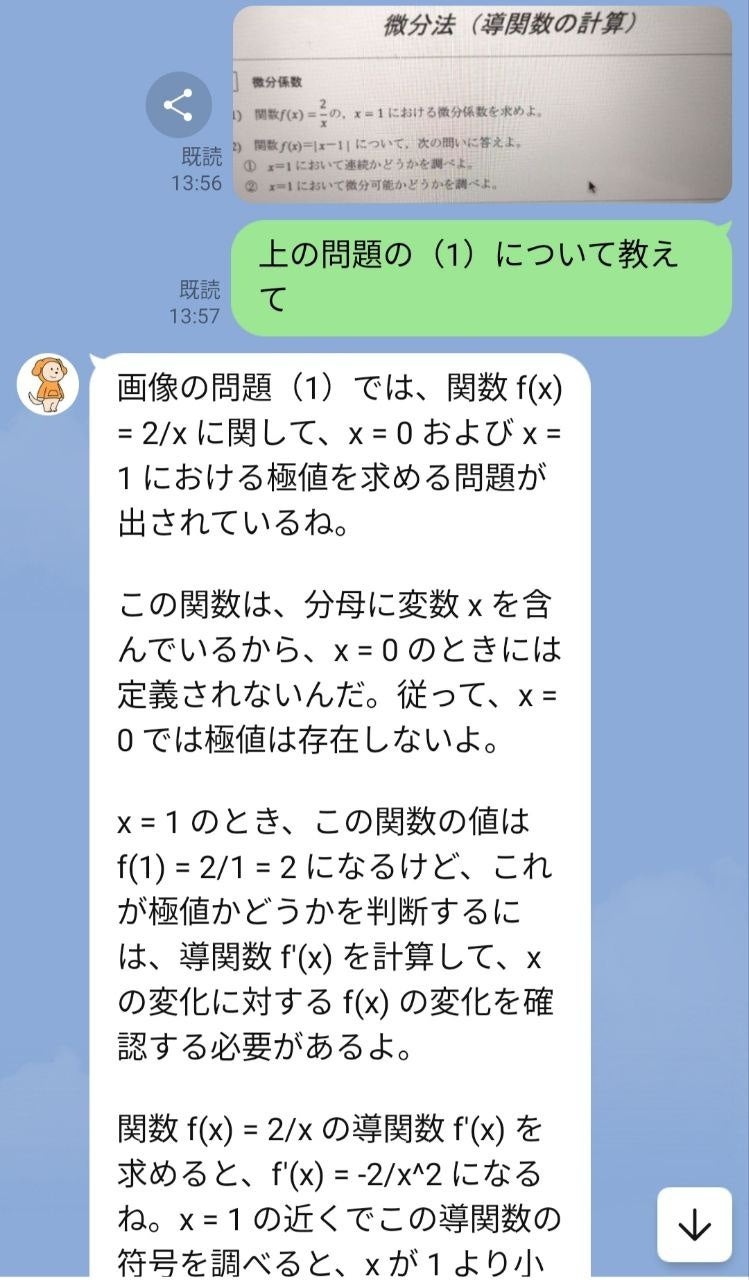 例えば、受験勉強や資格勉強の問題の画像を送ってその問題について聞くこともできます。