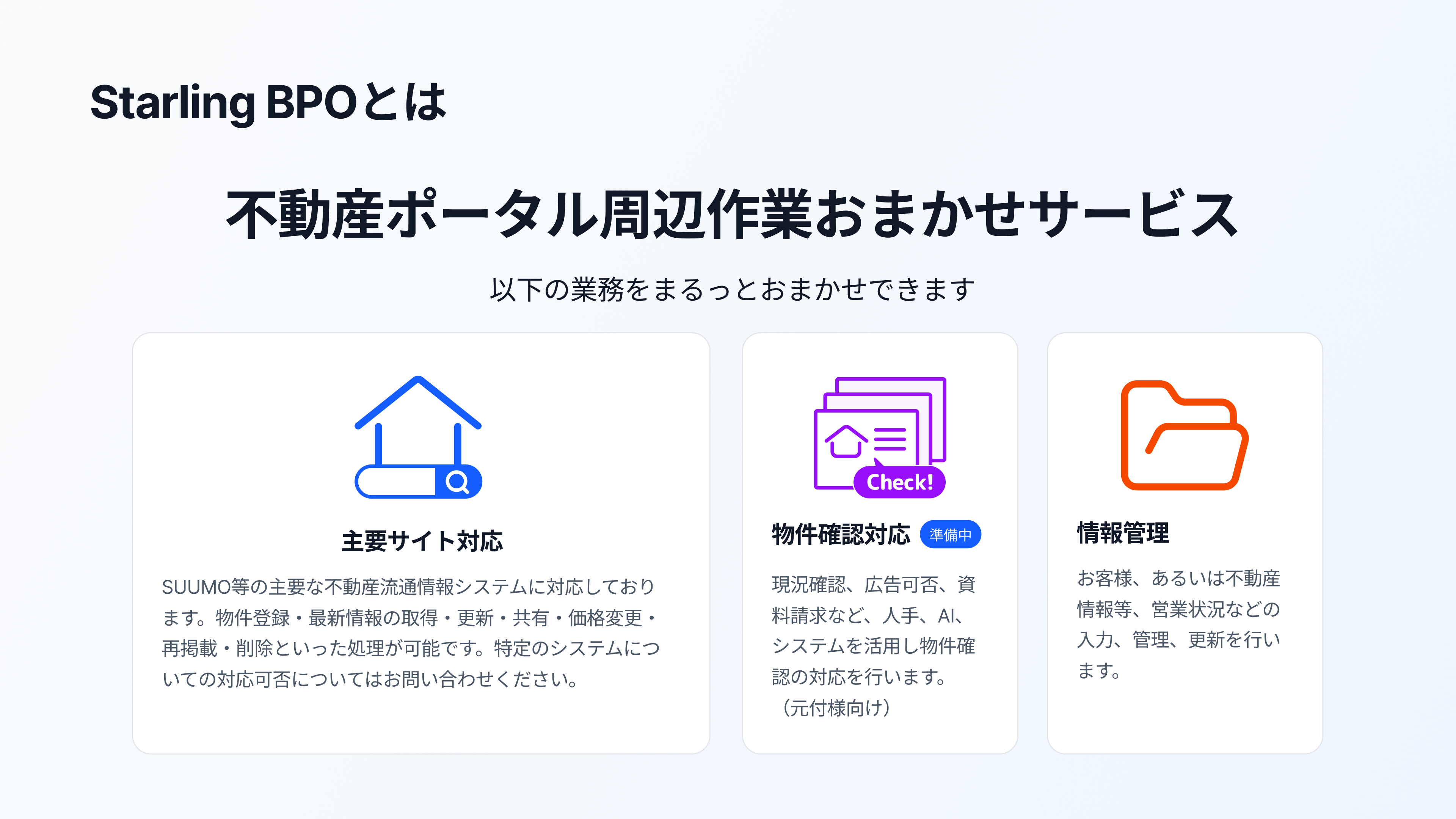 株式会社Starling(本社:中野区、代表取締役:本間 克仁)は、不動産ポータルサイト運営企業向けに、物件データの入稿・更新・管理を包括的に代行する「Starling BPO」を本日より提供開始いたします。