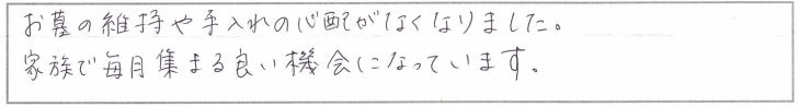 本調査のアンケート回答より:「お墓の維持や手入れの心配がなくなった。家族で毎月集まる良い機会になっています。」