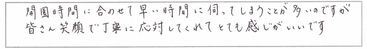 本調査のアンケート回答より:「開園時間に合わせて早い時間に伺うことが多いのですが、皆さん笑顔で丁寧に応対してくれてとても感じがいいです」
