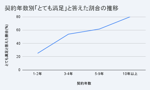 契約年数が長くなるほど最高評価の割合が段階的に上昇しています。各層のサンプルサイズが限定的であるため統計的有意差の断定はできませんが、年数の経過とともに満足度が低下しない。むしろ高まる傾向は明確に読み取れます。