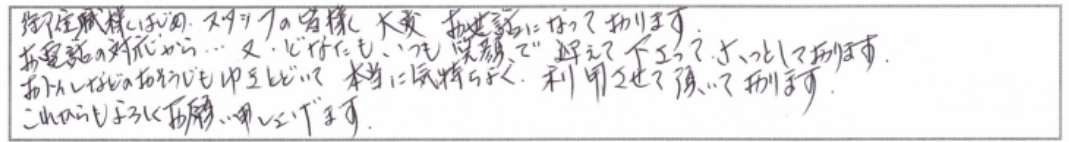 本調査のアンケート回答より:「御住職様をはじめ、スタッフの皆様に大変お世話になっております。お電話の対応から、又、どなたもいつも笑顔で迎えて下さってホっとしております。おトイレなどのお掃除も行き届いて、本当に気持ちよく利用させて頂いております。これからもよろしくお願い申し上げます。」