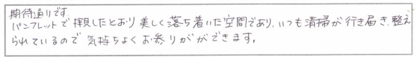 本調査のアンケート回答より:「期待通りです。パンフレットで拝見したとおり美しく落ち着いた空間であり、いつも清掃が行き届き、整えられているので気持ちよくお参りができます。」