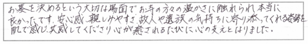 本調査のアンケート回答より:「お墓を決めるという大切な場面で、お寺の方々の温かさに触れられ、本当に良かったです。安心感、親しみやすさがあったこと、故人や遺族の気持ちに寄り添ってくれる姿勢を肌で感じ、共感してくださり、心が癒されるたびに心の支えとなりました。」