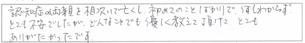 本調査のアンケート回答より:「認知症の両親を相次いで亡くし、初めてのことばかりで何もわからず、とても不安でしたが、どんなことでも優しく教えて頂けてとてもありがたかったです。」