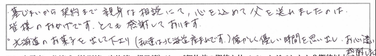 本調査のアンケート回答より:「墓じまいから契約まで親身な相談にて、心を込めて父を送れましたのは皆様のおかげです。とても感謝しております。北海道のお菓子を出してくださり(私達は北海道産まれです)懐かしく優しい時間を思い出し、お心遣いに感謝しました。」
