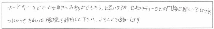 本調査のアンケート回答より:「カードキーなどを使って自由にお参りができたら良いと思うが、セキュリティーなどの問題で難しいだろうと考えている。これからもきれいな環境を維持してほしい。」