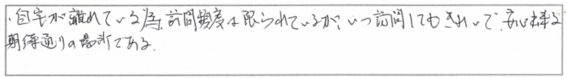 本調査のアンケート回答より:「自宅が離れているため訪問頻度は限られているが、いつ訪問してもきれいで、安心できる期待通りの場所である」