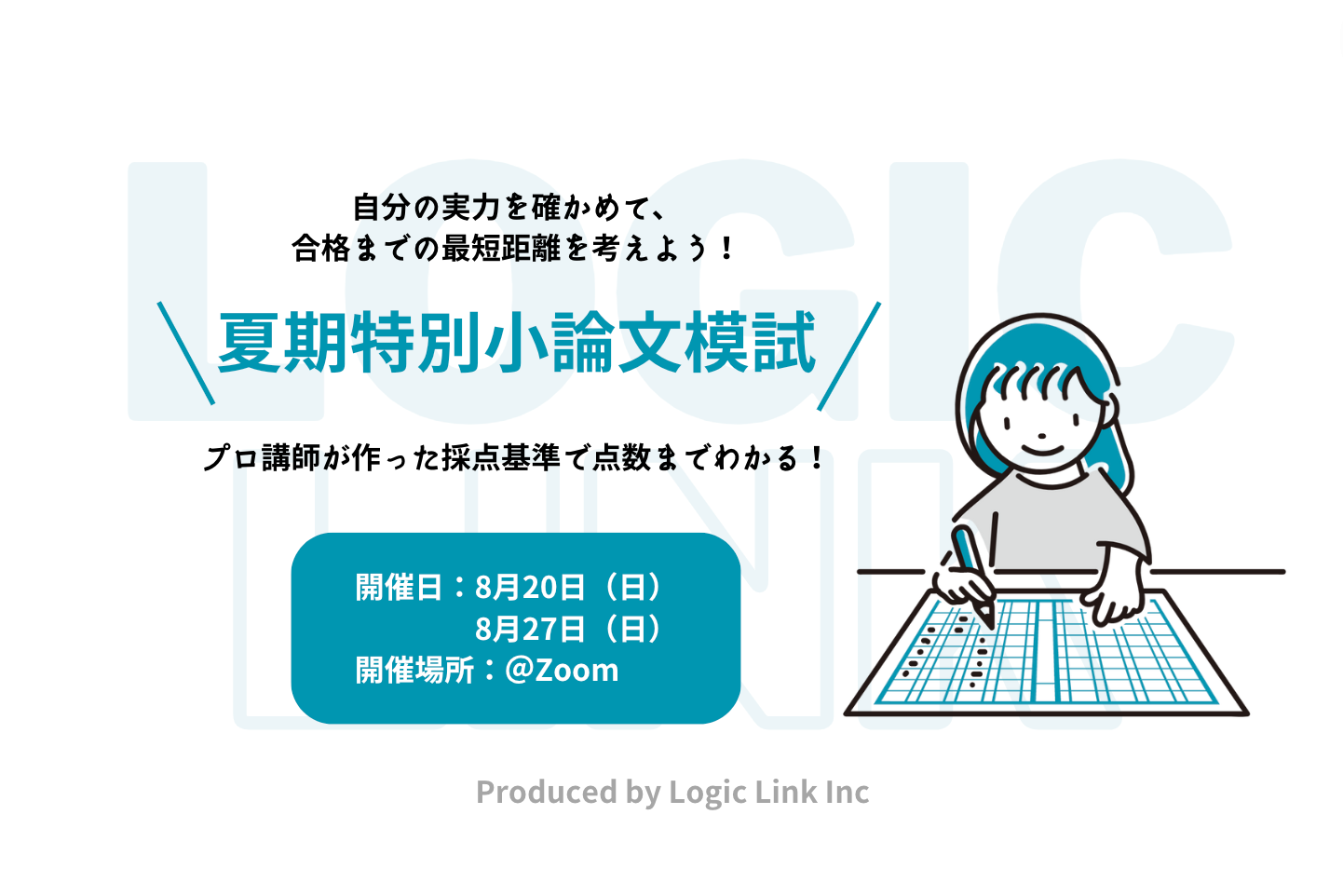 株式会社Logic Linkが運営するオンライン小論文塾Logic Linkが、【オンライン小論文模試】を開催します。参加者随時募集中です。