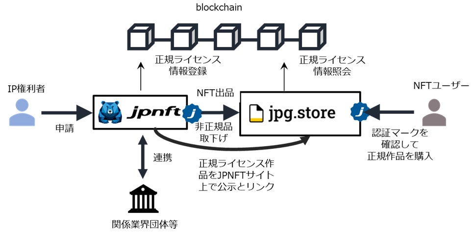 この課題を解決すべく、JPNFTとJPG Storeは、“安心安全なNFTマーケット”を構築し、利用者の皆様に正規のNFTを提供することを使命に、両社の強みをいかしてパートナーシップを結ぶことにいたしました。JPNFTが運営する、コンテンツIPのNFTに関する公式情報公示プラットフォーム「jpnft」に登録・公示されたコンテンツをJPG Storeが運営する「JPG Store」にて取引する場合には、jpnftでの正規ライセンス情報照会やjpnft認証マークの表示を通じて、正規NFTであることを確認できるようにします。