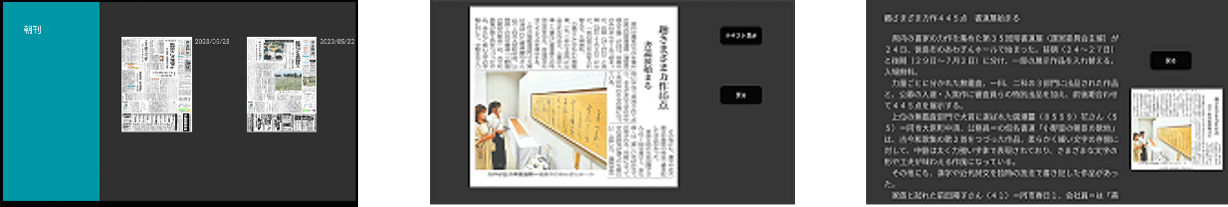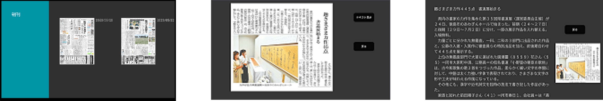 新聞紙面のイメージをそのままにテレビで閲覧することができます。見出しから選択し記事のテキスト情報や切り抜きイメージを見ることも可能です。