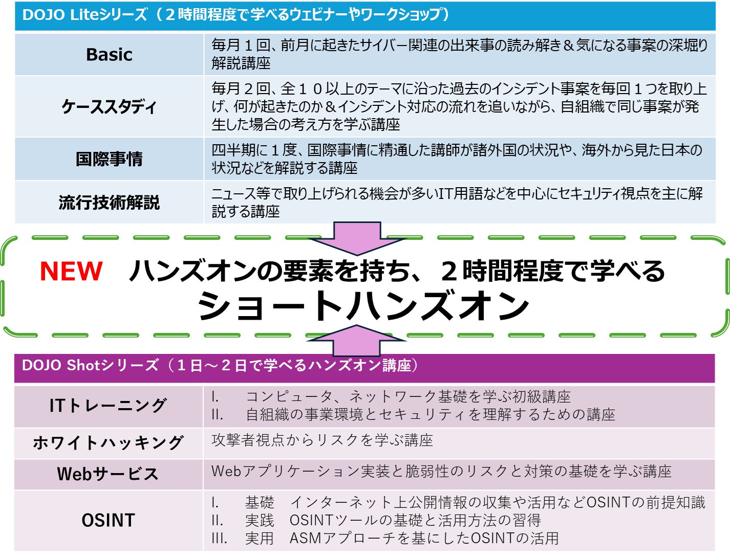 そこで、Armorisでは、2時間程度で学べる講座として、「聴く、考える」力を鍛えるDOJO Liteシリーズと、1日~2日で「手を動かしながら」身に付けるDOJO Shotを新設しました。セキュリティの第一線で活躍してきた講師が分かりやすく伝える講座となっていますので、これからセキュリティやITにかかわる方や、セキュリティに興味のある方におススメです。