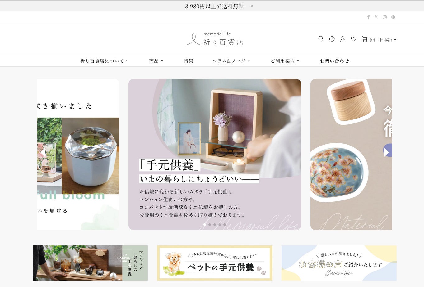 「祈り百貨店」は、手元供養品を専門に扱うネット通販サイトとして、2024年6月よりスタート致しました。大切な方が亡くなった時、宗教や形式にとらわれず、故人を中心にした弔いを現代の環境に合わせて提供しています。