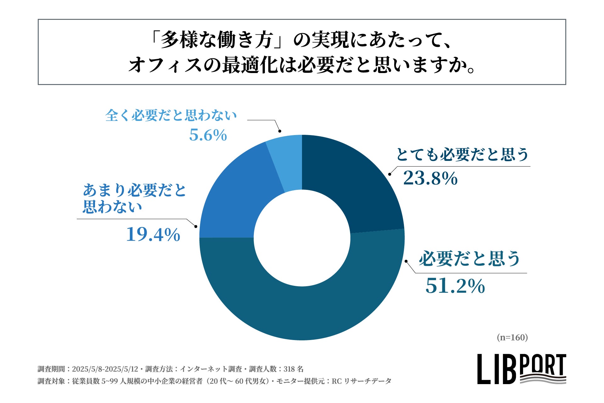 次に、「多様な働き方」を推進する何らかの施策を導入していると回答された方に「『多様な働き方』の実現にあたって、オフィスの最適化は必要だと思うか」を尋ねる設問への回答では、1位が「必要だと思う」で51.2%、2位が「とても必要だと思う」で23.8%、3位が「あまり必要だと思わない」で19.4%という結果になりました。1位と2位の回答を合計すると回答率75%となり、中小企業経営者の大半が「多様な働き方」の実現にあたって、オフィスの最適化が必要だと考えていることがわかりました。