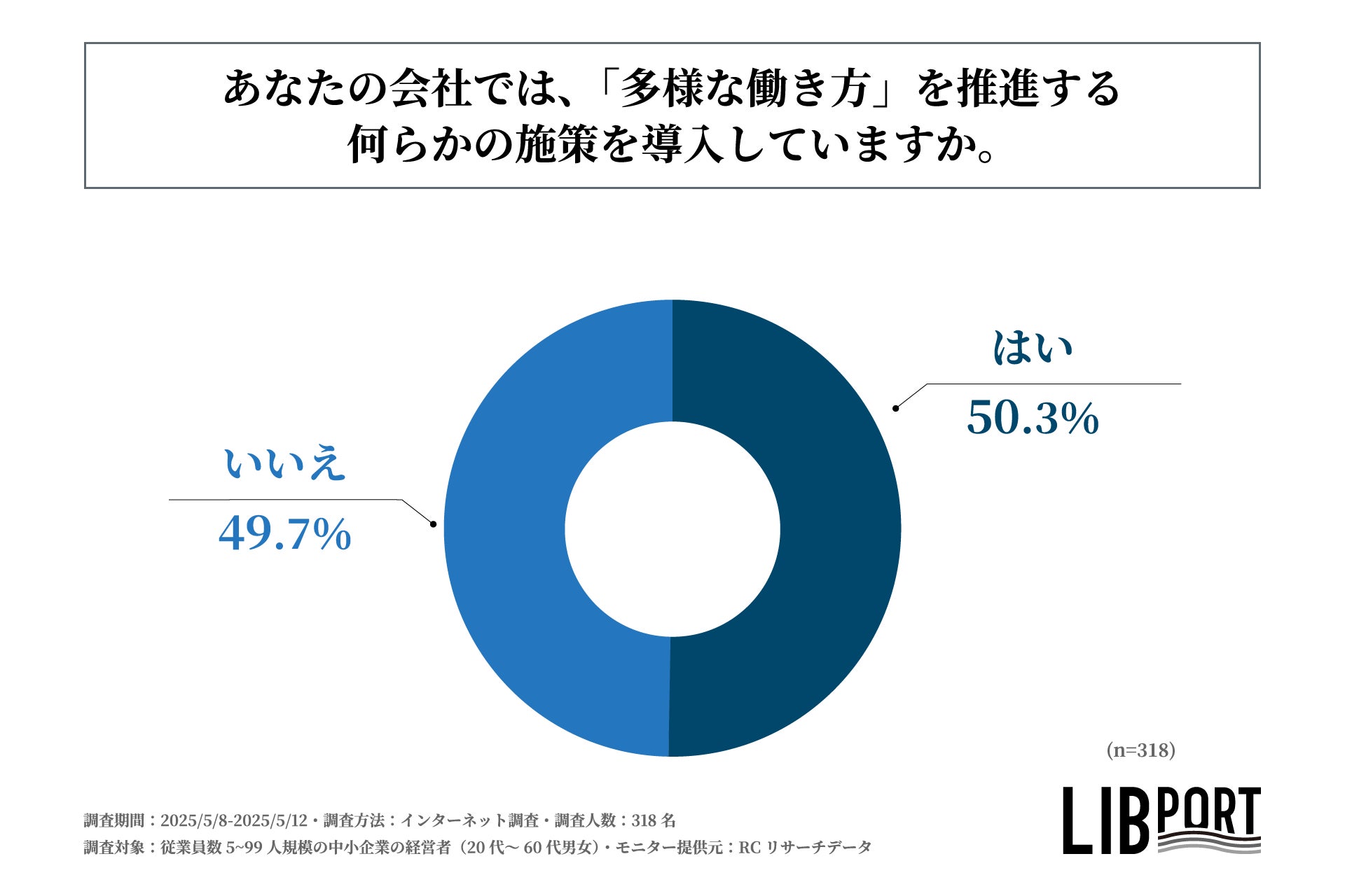 まず、「あなたの会社では、『多様な働き方』を推進する何らかの施策を導入しているか」を尋ねる設問への回答では、「はい」が50.3%、「いいえ」が49.7%という結果になりました。この結果から、従業員5人~99人規模の中小企業の約半数で「多様な働き方」を推進する何らかの施策が導入されていることが明らかになりました。