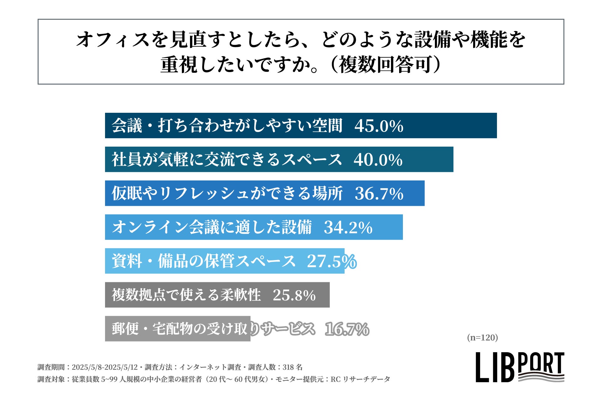 調査の最後、「多様な働き方」の実現にあたって、オフィスの最適化は必要だと思うと回答された方に「オフィスを見直すとしたら、どのような設備や機能を重視したいか」を尋ねる設問の回答で多かったのは、1位が「会議・打ち合わせがしやすい空間」で45.0%、2位が「社員が気軽に交流できるスペース」で40.0%、3位が「仮眠やリフレッシュができる場所」で36.7%という結果になりました。また、4位以降も、回答率30%前後の回答が複数並ぶ形となり、この結果から中小企業経営者がオフィスを見直すとしたら、重視したい設備や機能は多岐に渡ることがわかりました。
