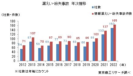 その一方で、企業のシステムやデータに対する攻撃を仕掛けるサイバー攻撃は巧妙化しており、社員のサイバー攻撃への知識不足から生じる情報漏洩も、企業にとって深刻な損失や法的なリスクをもたします。実際、東京商工リサーチが公開している調査データ「2年連続最多を更新 件数は165件、流出・紛失情」(2023年1月発表)によると、2年連続で情報漏洩データ訃音質の事故が増加しており、ますます情報基礎リテラシー・機密情報管理の重要性が高まっています。
