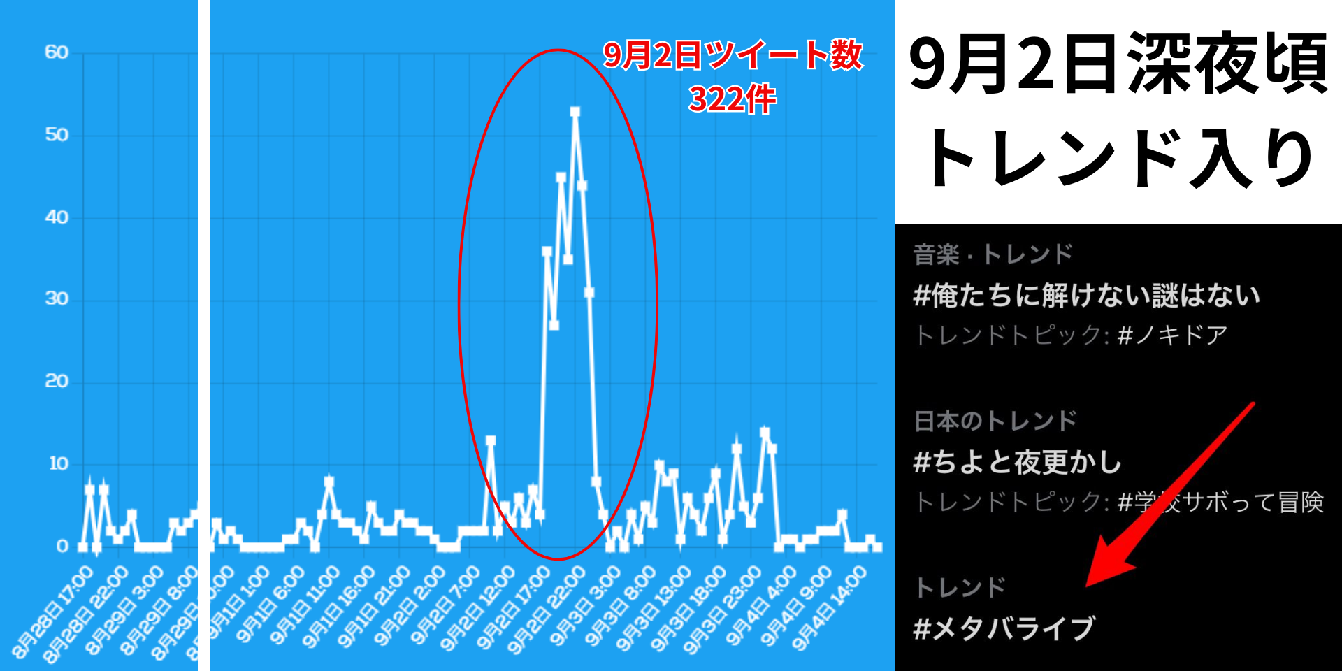 9月2日24時間の間で「メタバライブ」のキーワードでのツイート件数は322件で、翌日1時ごろにはX(Twitter)でトレンド入りも果たしました。