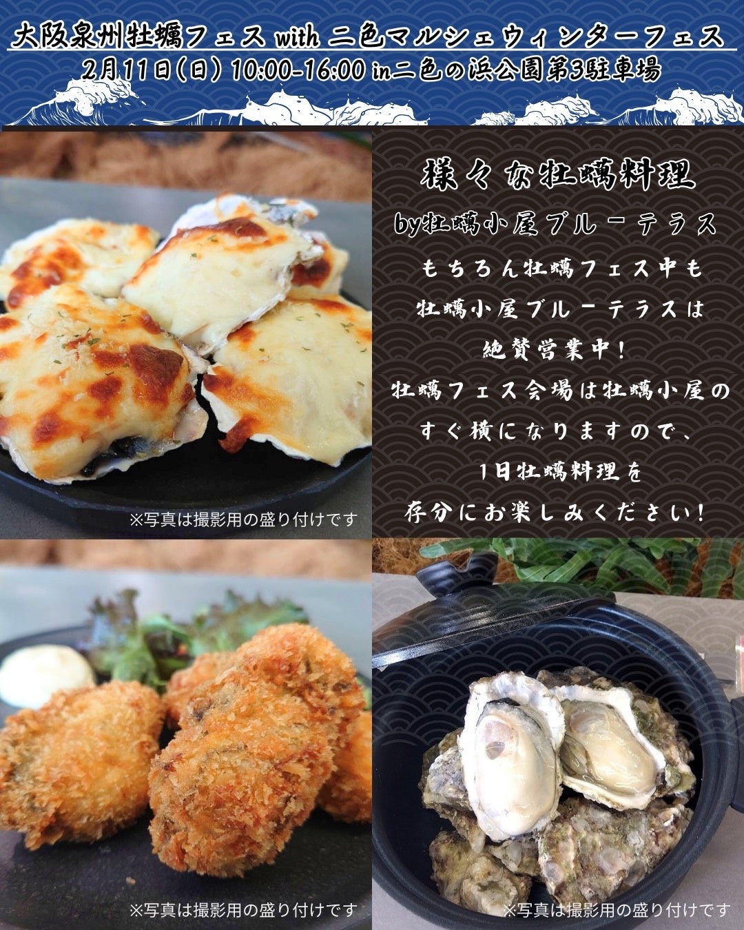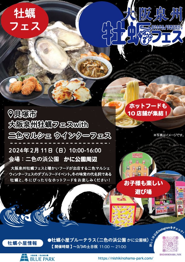 府営二色の浜公園BLUE PARKは大阪泉州牡蠣フェスwith二色マルシェウィンターフェス(主催:(株)二色の浜PX)を2024年2月11日(日)に開催いたします。