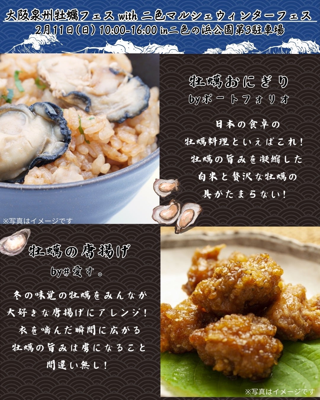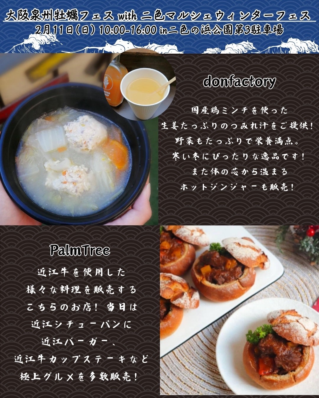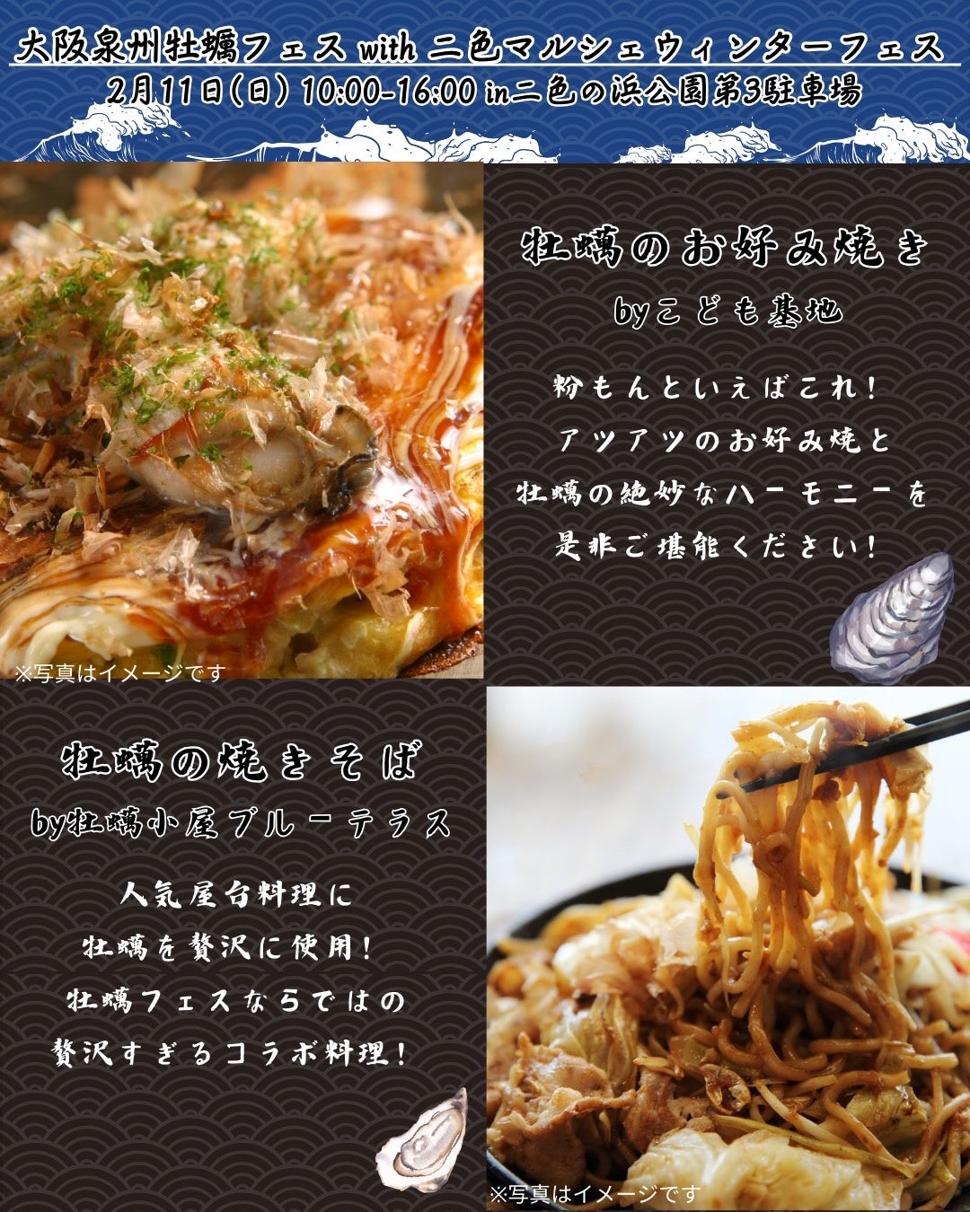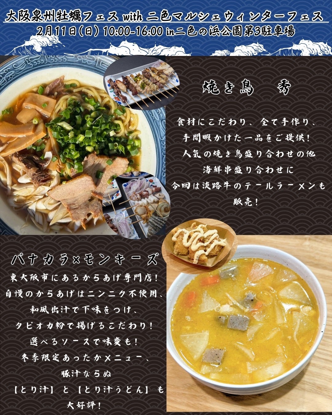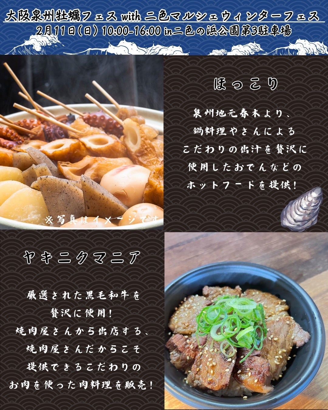 当イベントは大阪泉州牡蠣フェスと温かいフード等が出店する二色マルシェウィンターフェスのダブルフードイベント。冬の味覚の代名詞である牡蠣と、冬にぴったりなホットフードをお楽しみ頂けます!