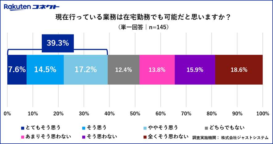 在宅勤務をしていないオペレーターに対し、現在行っている業務は在宅勤務でも可能かどうかを聞いたところ、7.6%が「とてもそう思う」、14.5%が「そう思う」、17.2%が「ややそう思う」と回答し、合わせて39.3%が「現在の業務は在宅でも可能」と回答する結果になりました。