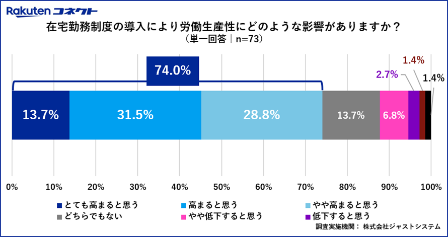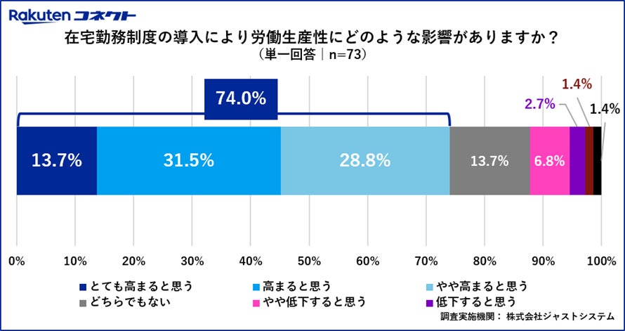 在宅勤務をしているオペレーターに対し、在宅勤務制度の導入により労働生産性にどのような影響があるのかを聞いたところ、13.7%が「労働生産性がとても高まると思う」、31.5%が「労働生産性が高まると思う」、28.8%が「労働生産性がやや高まると思う」と回答しました。合わせて74.0%が「在宅勤務により労働生産性が高まる」と回答する結果となり、在宅勤務による労働生産性の高まりを感じている傾向がみられました。