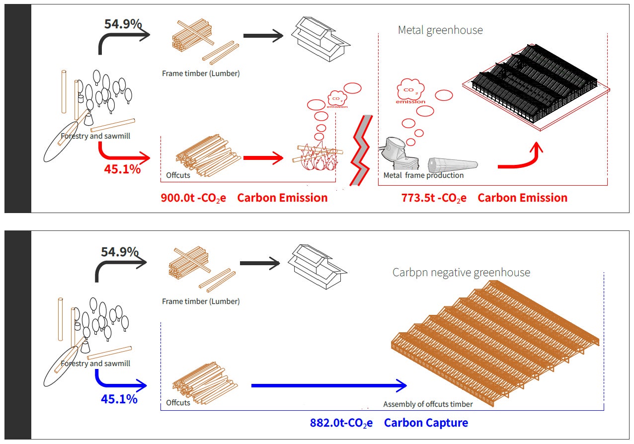 鉄骨造家型のグリーンハウス(温室)と価格は同等で、素材としての断熱性能や耐塩害性等が高く、またライフサイクルでのCO2排出量を排出から吸収に転じることができる温室です。すでに三重県志摩市にて実証導入が進んでおり、農業生産者、観光事業者、大学・研究機関、自治体などから問い合わせが増加しています。地域のサステナビリティとレジリエンスを長期的に高めるための有効な策として、全国展開を致します。